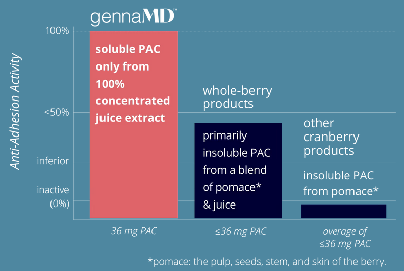 The quality of the PAC, which is directly related to the manufacturing process, matters. GennaMD is made by using an advanced double extraction process that ensures the PAC are takenonlyfrom cranberry juice extract.