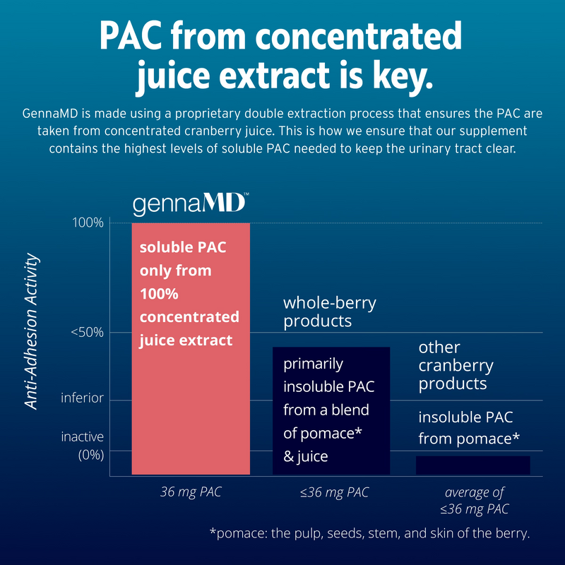 - CLINICALLY PROVEN 36MG PAC FOR URINARY TRACT HEALTH GennaMD delivers 36mg of clinically proven PAC sourced from 100% cranberry juice extract. Backed by scientific studies and recommended by urologists, it helps flush your urinary tract of UTI-causing bacteria—before they stick.