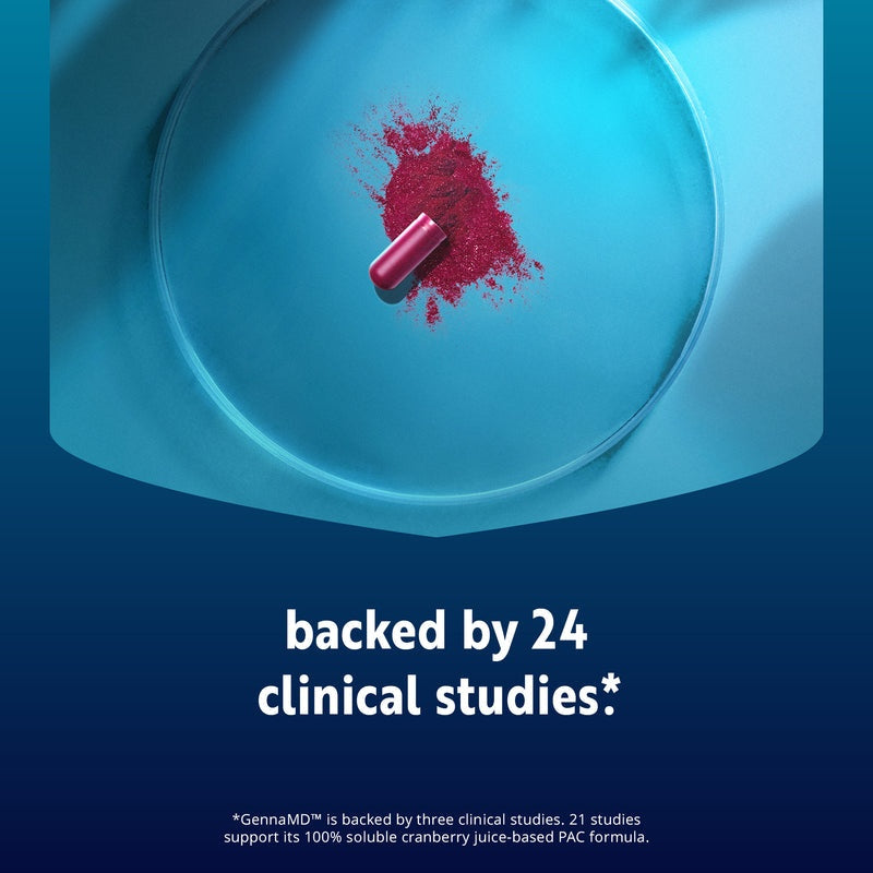 GennaMD™ is a urologist-recommended urinary health supplement with clinically proven 36 mg PAC, sourced only from pure cranberryjuice extract—not skins or stems like most other cranberry supplements. Its 100% soluble, medical-grade PAC delivers maximum bacteria-blocking power and the highest PAC concentration available (30% vs. just 1–18% in others). Backed by 24 clinical studies,*GennaMD is also the smallest cranberry capsule on the market for recurrent UTIs.
